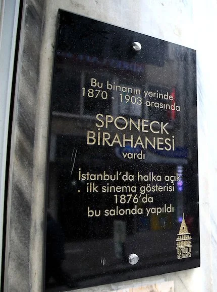 Opened in the early 1870s on the Grande Rue de Péra, no. 246, Sponeck was renowned for its Italian delicacies and biscuits served München beers. Owned by a Rum named Alataris, Sponek became the first place in Istanbul to screen a moving picture by the Lumiere Brothers on January 16th, 1897.