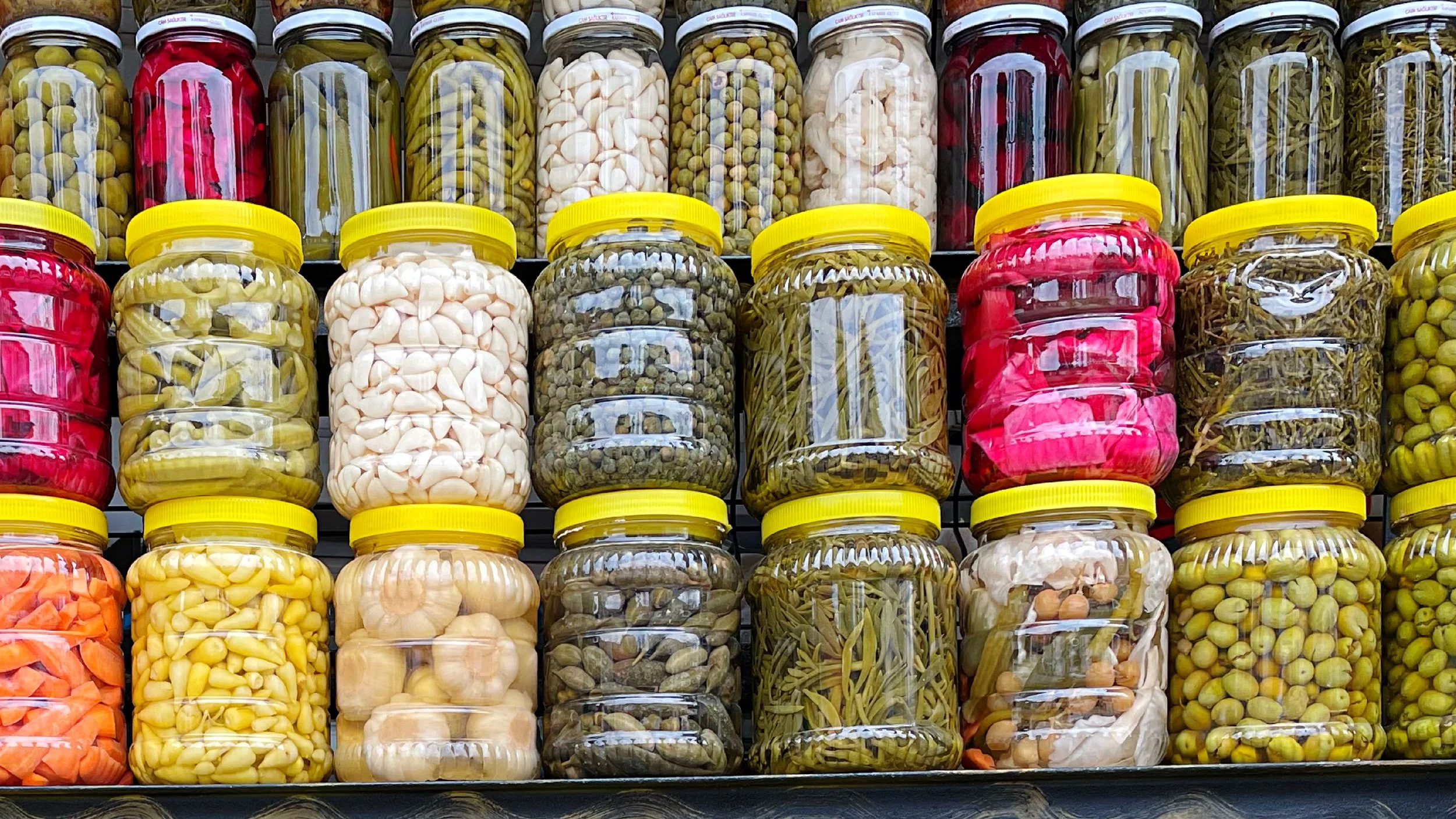 Different countries pickle different vegetables and fruits. Yet, as many a foreign visitor to Istanbul has noted, Turks seem to pickle everything: cabbage, cucumbers, tomatoes, runner beans, green peppers, garlic, okra, unripe melon, Armenian cucumbers (acur), aubergines, red bell peppers, sour red plums, carrots, red cabbage, beets, sour cherries, apricots, green almonds…